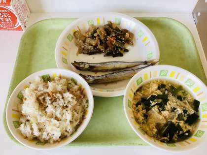 今日の給食は、子ぎつねごはん、焼きししゃも、くきわかめのきんぴら、にらたまみそ汁、牛乳です。