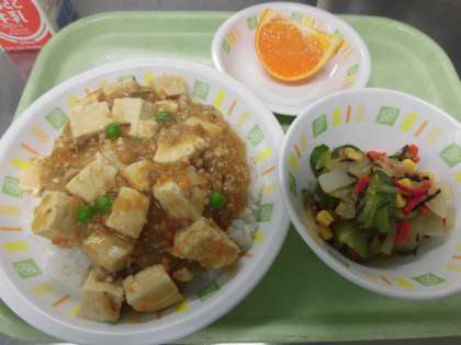 今日の給食は、マーボー豆腐丼、大根とひじきのサラダ、せとか、牛乳です。