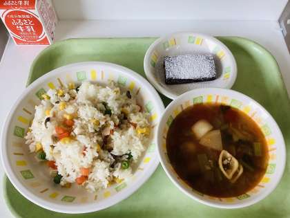 今日の給食は、三色ピラフ、ミネストローネ、ブラウニー、牛乳です。