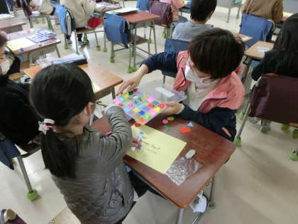 折り紙を切ったいろいろな色や形の飾りを使いカードを作りました。