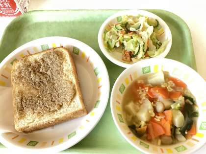 今日の給食は、セサミトースト、ツナサラダ、ABCスープ、牛乳です。