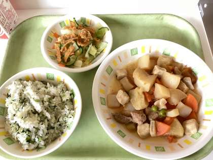 今日の給食は、青菜とじゃこのごはん、豚肉と大根のうま煮、パリパリサラダ、牛乳です。パリパリサラダは、5年生のリクエストメニューです。