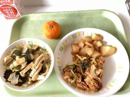 今日の給食は、わかめうどん、かきあげ、じゃがいもの甘辛煮、みかん、牛乳です。