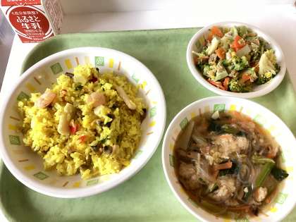 今日の給食は、パエリア、ブロッコリーとツナのサラダ、肉団子入り春雨スープ、牛乳です。