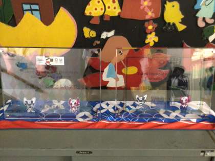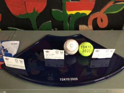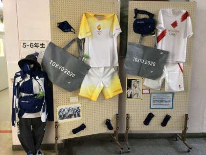この取り組みに東京都から表彰状をいただきました。合わせて、聖火ランナーのユニフォームや、実際の大会で使用されたメダルトレイ、ボール、大会ボランティアのユニフォームなどが届きました。これらを、職員室前に展示しています。