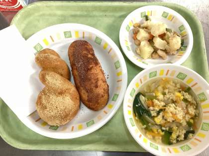 今日の給食は、きなことココアの2色あげパン、卵とチーズのふわふわスープ、ビーンズサラダ、牛乳です。