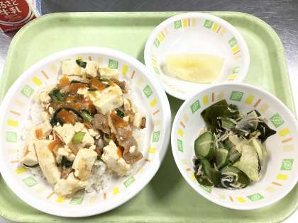 今日の給食は、家常豆腐丼(じゃーじゃんどうふどん)、じゃこサラダ、りんご(ふじ)、牛乳です。