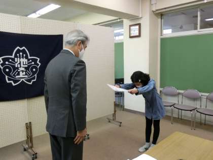 全クラスの代表の児童が、校長先生から修了証をいただきました。