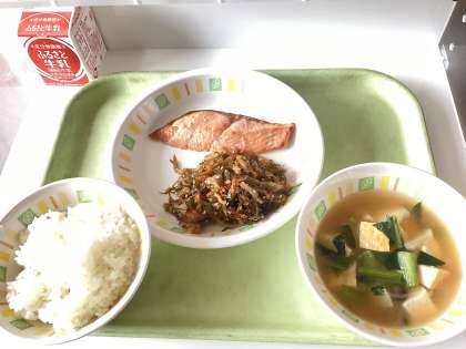 今日の給食は、ごはん、鮭の照り焼き、五目きんぴら、生揚げのみそ汁、牛乳です。