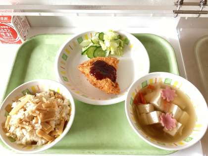 今日の給食は、たけのこごはん、チキンカツ、野菜のひとしお、春の祝い汁、牛乳です。今日は、入学、進級のお祝い献立です。