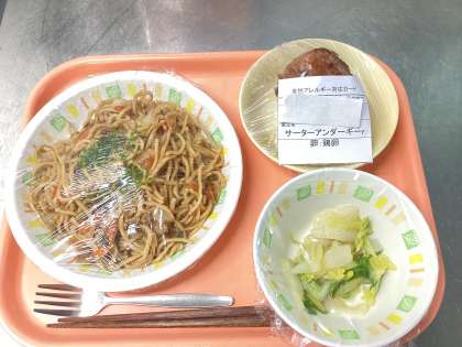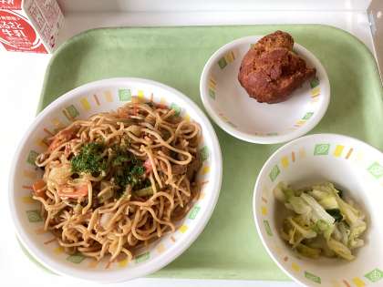 今日の給食は、ソース焼きそば、ラーパーサイ、サーターアンダーギー、牛乳です。下の写真は、アレルギー対応給食(鶏卵を抜いたサーターアンダーギー)です。