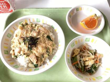 今日の給食は、親子丼、カリカリ油揚げと野菜の酢味噌和え、清見オレンジ、牛乳です。
