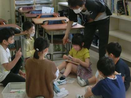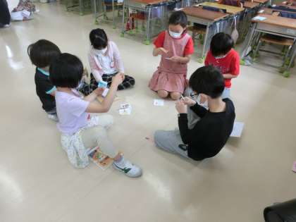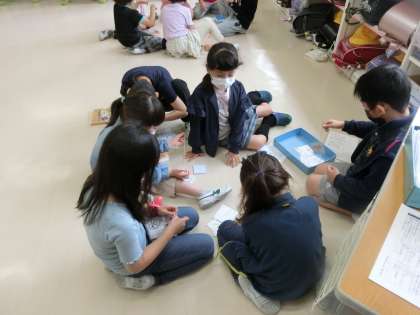 2年生が、1年生に“ぶんぶんごま”の作り方を教え、