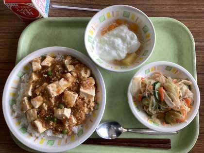 4月27日(水)の給食は、麻婆豆腐丼、春雨サラダ、フルーツヨーグルト、牛乳です。
