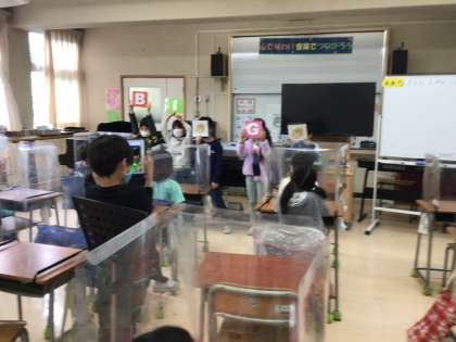 「BINGO」ではボランティアの子どもたちがあげたカードを見て、全員で音楽に合わせて手拍子をしました。