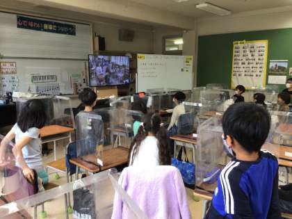 昨年に引き続き、初回の音楽朝会では2年生から6年生が校歌を歌っている様子の動画を繋ぎ、全校で見ます。