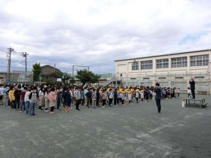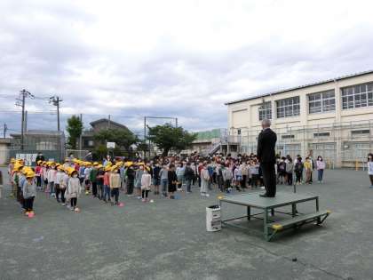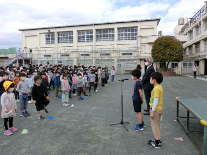 今日は校庭で全校朝会を行いました。6年生のあいさつでは、