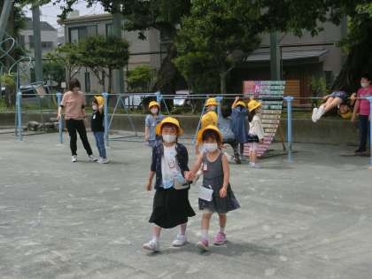 1年生ふたクラスが黄色い帽子を被って