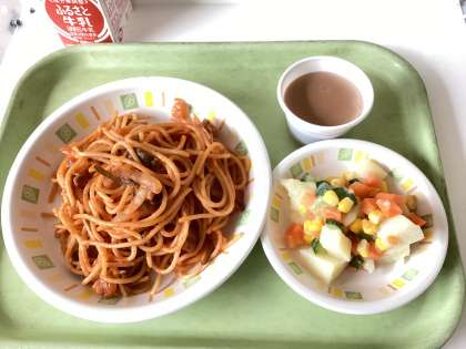 今日の給食は、スパゲティナポリタン、マセドアンサラダ、ほうじちゃプリン、牛乳です。