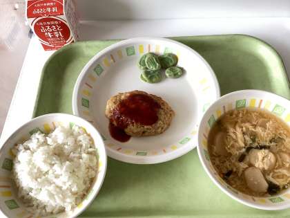 今日の給食は、ごはん、豆腐入りハンバーグ、ゆでそら豆、にらたまみそ汁、牛乳です。