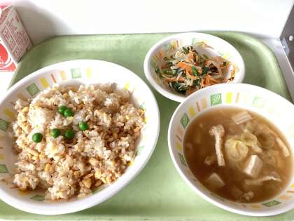 今日の給食は、そぼろごはん、三色ナムル、豆腐のみそ汁、牛乳です。