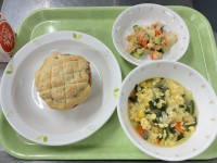 今日の給食は、中華丼、きゅうりと大根のごま風味、フルーツポンチ、牛乳です。