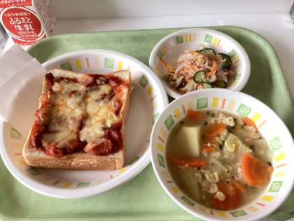 今日の給食は、ピザトースト、ABCスープ、もやしとツナのサラダ、牛乳です。