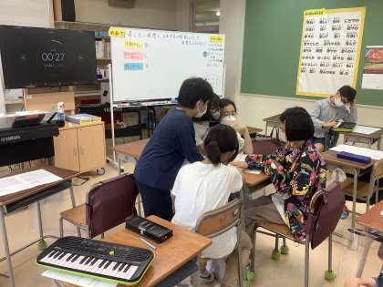3グループで作戦タイム(グループでどんな工夫をするか相談する時間)、チャレンジタイム(楽器を選んだり、練習する時間)、特訓タイム(ミニキーボードで特訓する時間)を順番に回していきます。