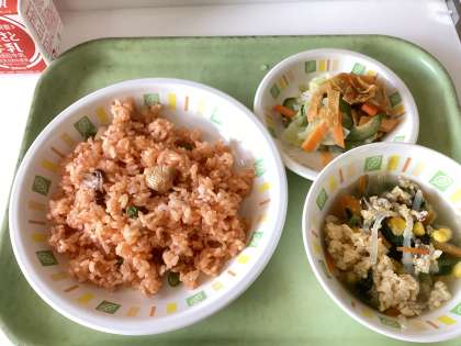 今日の給食は、チキンライス、卵とチーズのふわふわスープ、パリパリサラダ、牛乳です。
