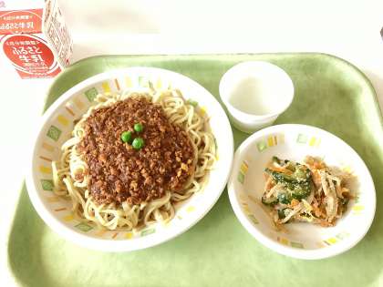 今日の給食は、ジャージャー麺、もやしのごま酢あえ、ホワイトゼリー、牛乳です。