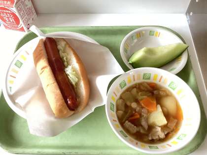 今日の給食は、ホットドック、白いんげんの田舎風スープ、メロン、牛乳です。