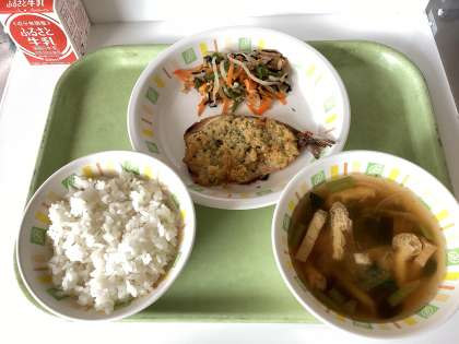 今日の給食は、ごはん、いわしのガーリックパン粉焼き、ピーマンのおひたし、豆腐のみそ汁、牛乳です。