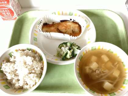 今日の給食は、シイラのみそマヨネーズ焼き、野菜のゆかりあえ、豆腐汁、牛乳です。