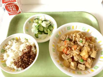 今日の給食は、五分づきごはん、かつおでんぶ、肉じゃがうま煮、野菜のひとしお、牛乳です。