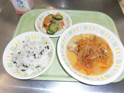 今日の給食は、わかめご飯、サバの甘酢あんかけ、シャキシャキ野菜、牛乳です。