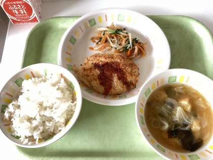 今日の給食は、ごはん、コロッケ、野菜の梅おかかあえ、キャベツのみそ汁、牛乳です。