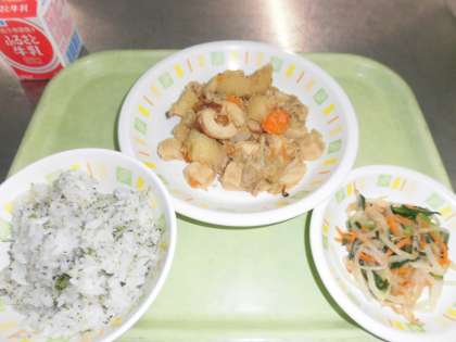 今日の給食は、青のりとじゃこのご飯、韓国風肉じゃが、野菜の酢味噌和え、牛乳です。