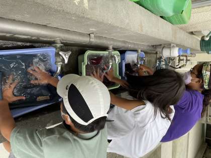 今日は学校で毎日使っていて、夏休みにも持ち帰らない「防災頭巾」のカバーを手洗いしました。ずーっと洗っていなかった人のものは、洗い桶の水が灰色になるくらいに汚れていてびっくり!押し洗いをして、よくすすぎ、スッキリしたところで干しました。