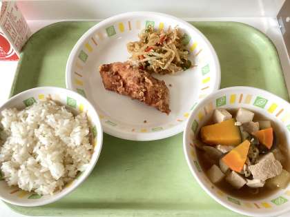 今日の給食は、五分づきごはん、さわらの竜田揚げ、もやしのカレーじょうゆかけ、夏野菜の豚汁、牛乳です。