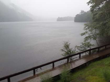途中、戦場が原も、湯滝も、そして、湯ノ湖も雲の中、雨降りです、