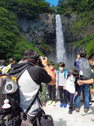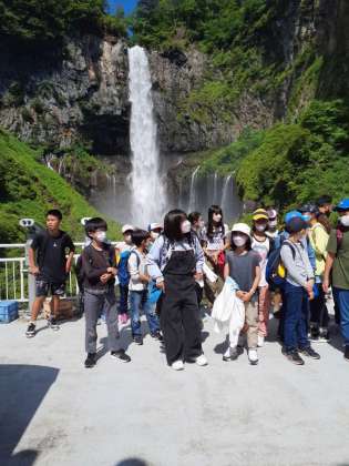 学級ごとに、華厳の滝をバックに集合写真を撮りました。
