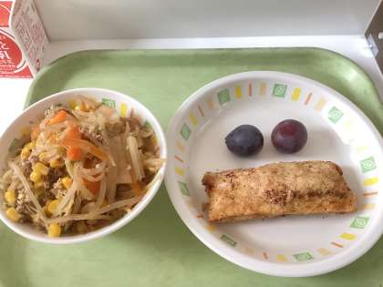 今日の給食は、みそラーメン、鶏肉とチーズの春巻き、ピオーネ、牛乳です。