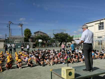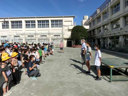 今日は久しぶりに全児童が集合して、校庭で行いました。