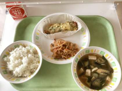 今日の給食は、七分つきごはん、シイラのポテマヨ焼き、切干し大根の煮付け、なすのみそ汁、牛乳です。