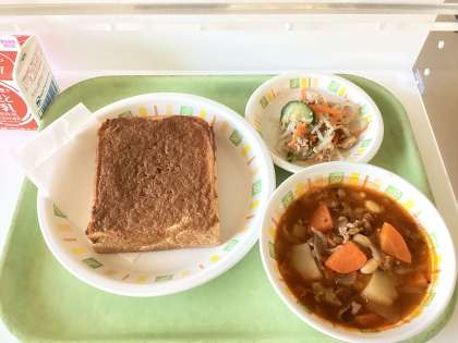 今日の給食は、きな粉バタートースト、ボルシチ、もやしとツナのサラダ、牛乳です。