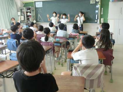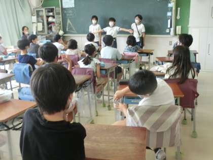 説明し、実際に、教室でミニ応援合戦をしていました。