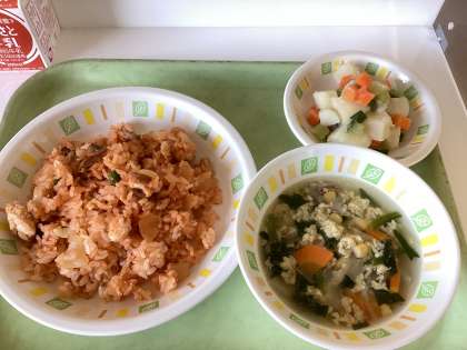 今日の給食は、チキンライス、卵とチーズのふわふわスープ、マセドアンサラダ、牛乳です。