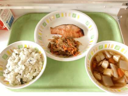 今日の給食は、青菜とじゃこのごはん、鮭の西京焼き、きんぴらごぼう、けんちん汁、牛乳です。