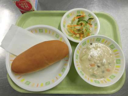今日の給食は、イチゴジャムコッペサンド、クラムチャウダー、コールスローサラダ、牛乳です。
