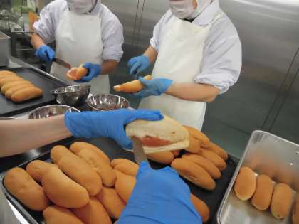 イチゴジャムコッペサンド、児童分と教職員分を合わせて約400本、全て給食調理員の方の手作業でコッペパンにジャムを塗ってくださっています。調理してくださる方の想いも感じながら、今日も、美味しくいただきました。